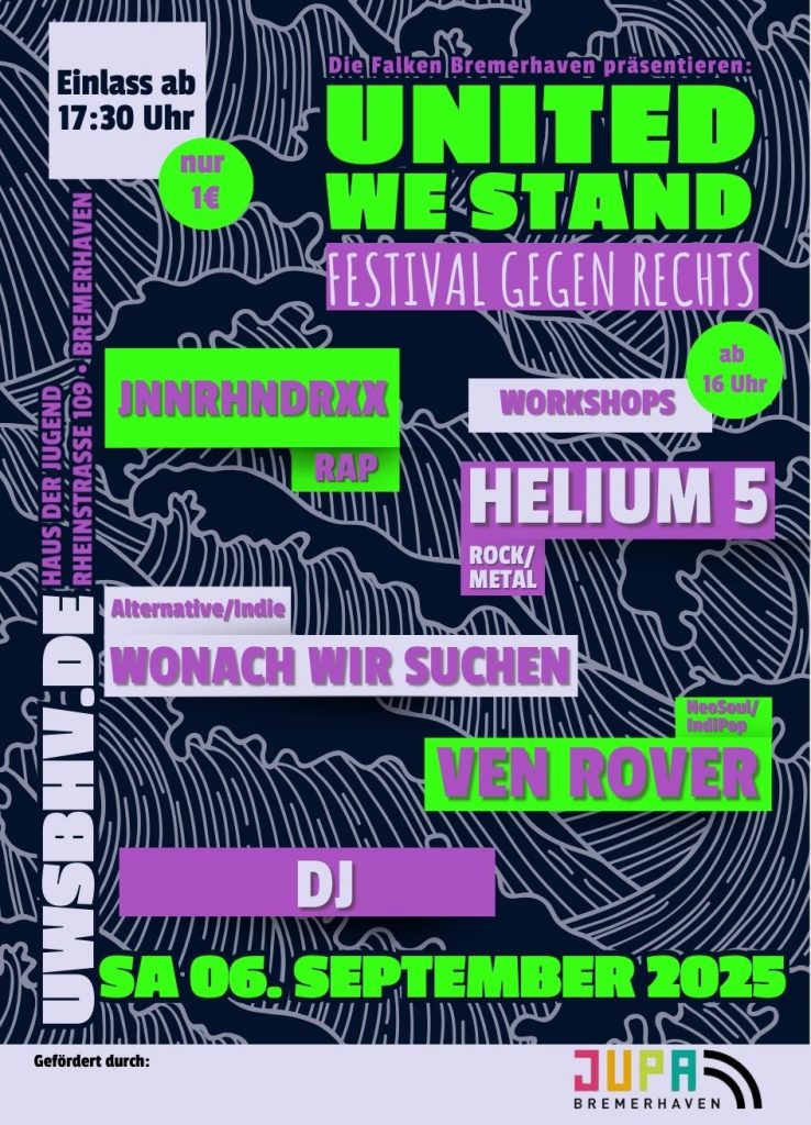 Wir wollen mit Musik und Workshops ein Zeichen gegen gruppenbezogene Menschenfeindlichkeit, gegen Rassismus, Antisemitismus, Sexismus, Homophobie und Nazis setzen. Unter dem Namen „UNITED WE STAND – FESTIVAL GEGEN RECHTS“ findet es nun seit 2017 jährlich im Haus der Jugend in Bremerhaven statt.