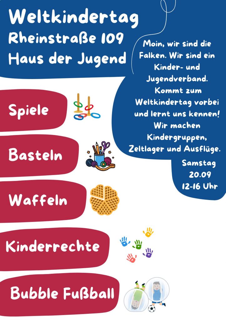 Du findest uns am 20.09.2025 zwischen 12:00 Uhr und 16:00 Uhr am Haus der Jugend (Rheinstr. 109) auf der Wiese vor dem Haus. Es gibt Waffeln, Bubble-Fussball und Spiele.